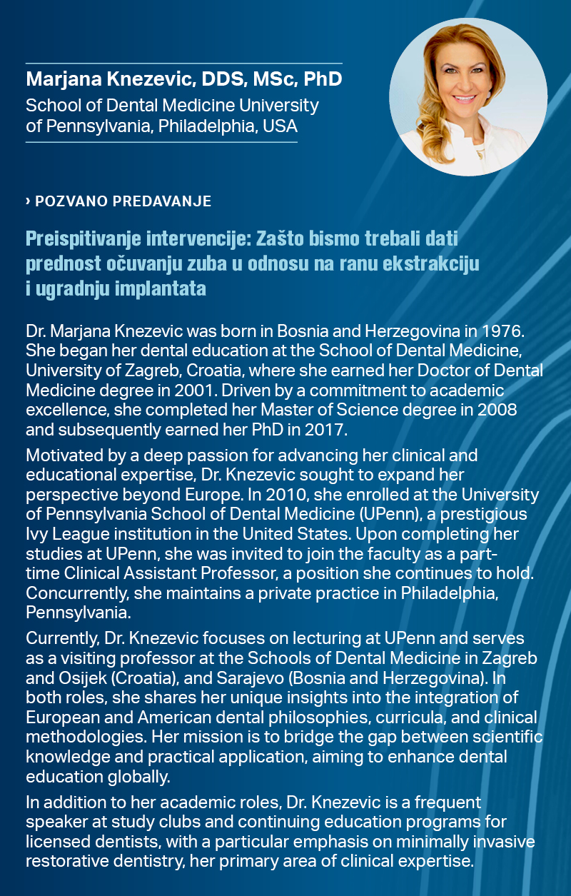 Ovaj Kongres predstavlja priliku ne samo za stjecanje novih stručnih znanja, već i za jačanje profesionalnih veza i poticanje suradnje među kolegama iz različitih specijalnosti. Interakcija s kolegama, razmjena ideja, te komunikacija s našim sponzorima sigurno će potaknuti daljnji razvoj naših struka i unaprijediti našu svakodnevnu praksu.